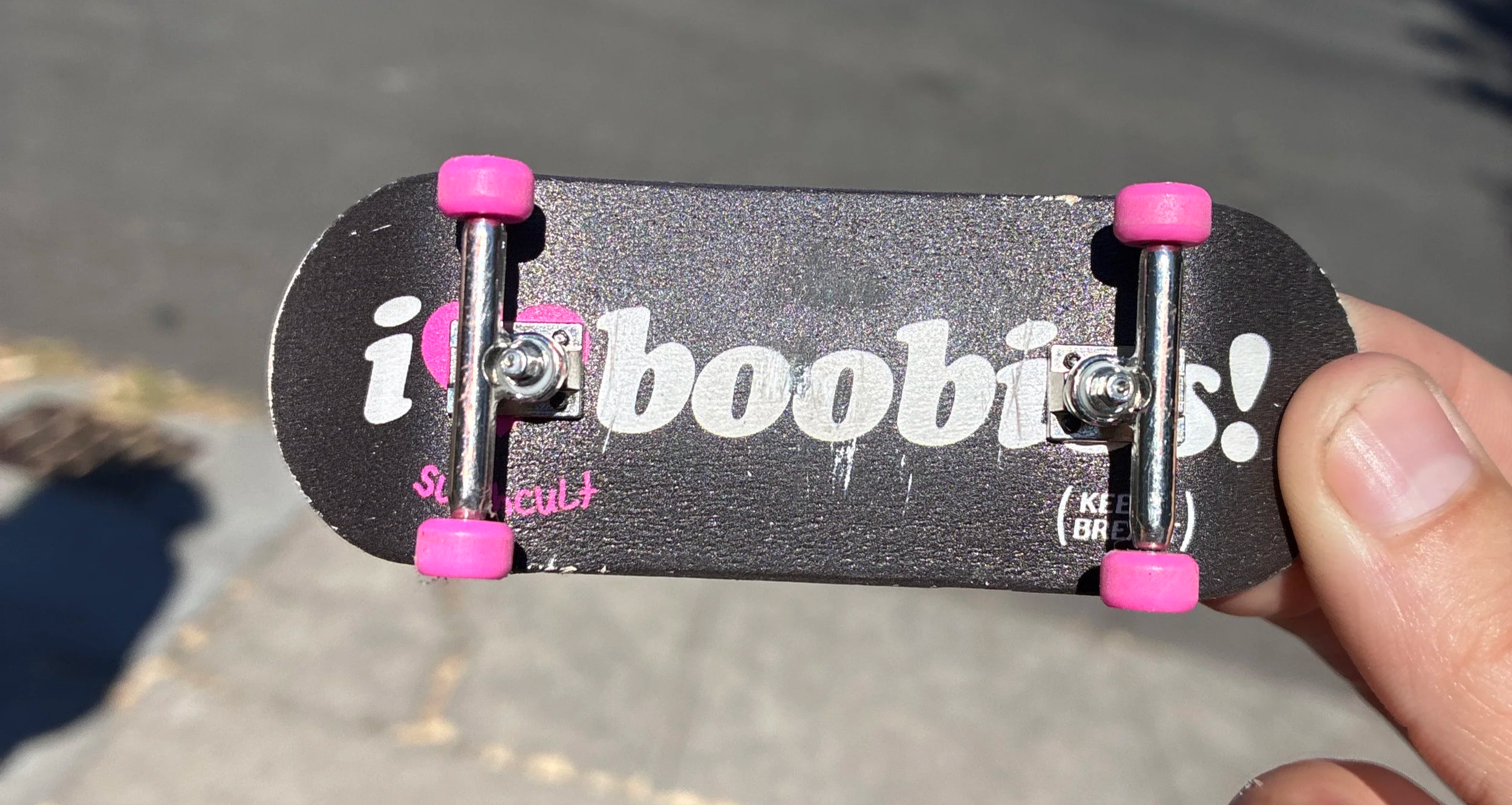 The Keep a Breast x Slushcult board that I did drop out of a balcony.